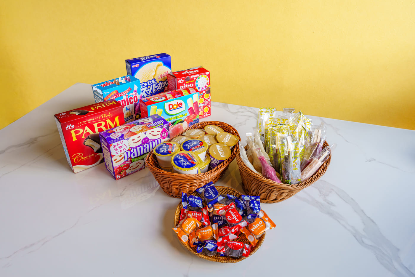 ご用意しているのは、誰もが知るおなじみの人気アイス各種。チェックイン後からチェックアウトまで、すべて無料、食べ放題でご提供いたします。
